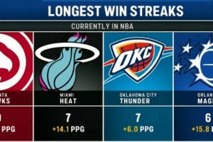 联盟目前最长连胜数:老鹰9连胜 热火&雷霆7连胜 魔术6连胜