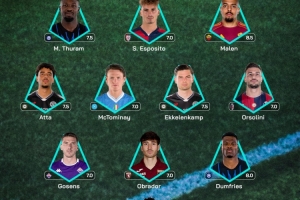 体育资讯4月14日讯 意甲第32轮已经结束了全部的争夺,联赛官方评选出了本轮最佳阵,马库斯·图拉姆、邓弗里斯领衔,马伦、麦克托米奈在列。