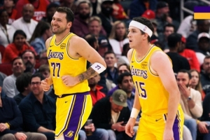 六连胜!湖人发布赢球海报:封面人物为东契奇+里夫斯