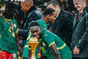 塞内加尔中卫尼亚卡特社媒晒出非洲杯决赛颁奖仪式的照片,抗议非足联剥夺塞内加尔冠军,配文:“这不是AI,而是现实。”